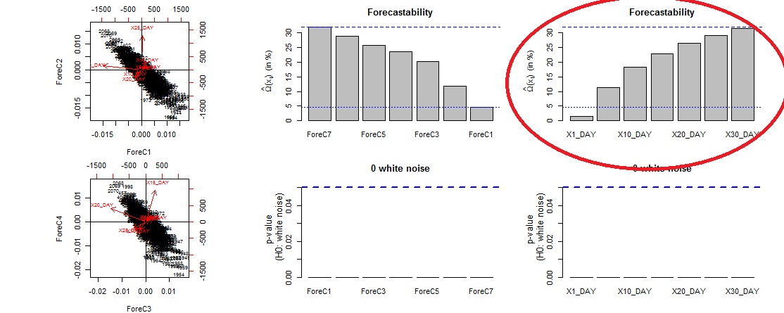 Here are the results. Note: ForeCA reorders the columns from most to least forecastable (after transformation), so for the sake of simplicity, just pay attention to the 'Orig' series' omega scores and the top right bar chart. (bars labeled X1-Day through X30_DAY). As you can see, the noise/signal ratio and your ability to forecast improves as the number of days increases.